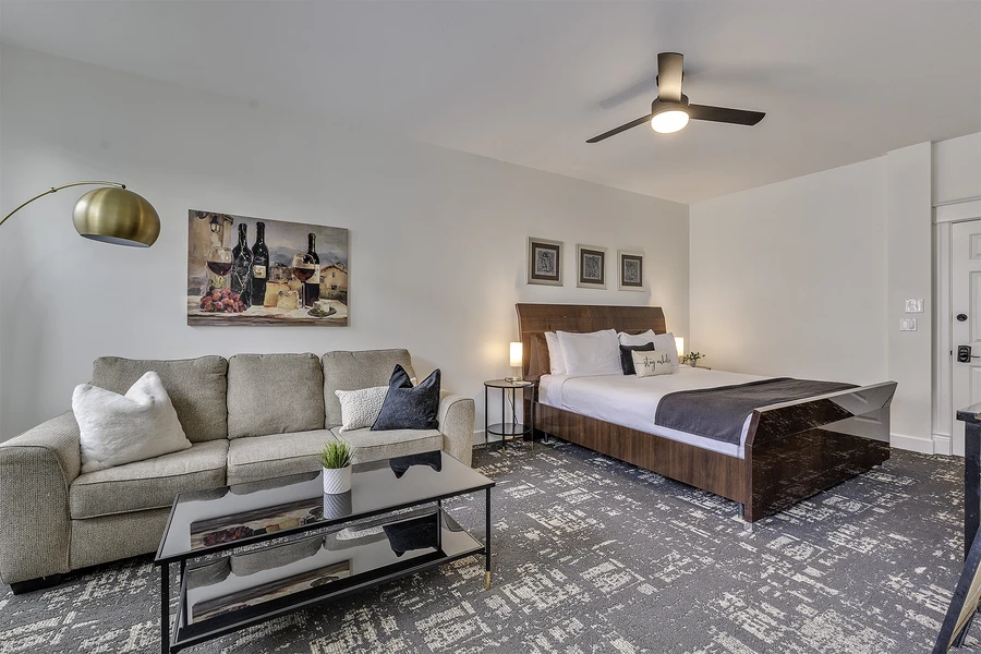 Luxurious, spacious, and perfectly suited for the discerning traveler. This refined room features a plush King bed with high thread-count sheets, a crisp white duvet, and your choice of hypoallergenic pillows. A stylish sitting area, bathed in natural light, offers comfort and relaxation. The private spa-inspired bathroom boasts a soaking tub, a step-in shower, and elegant dual sinks, all illuminated by a skylight. Functional amenities include a dedicated workspace with a desk and operable windows that invite fresh air. Designed with sophistication and comfort in mind, this room is your ideal retreat after exploring Orenco Station.
