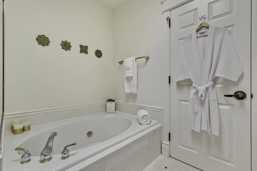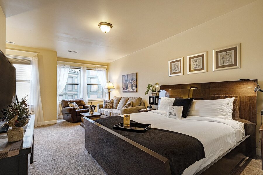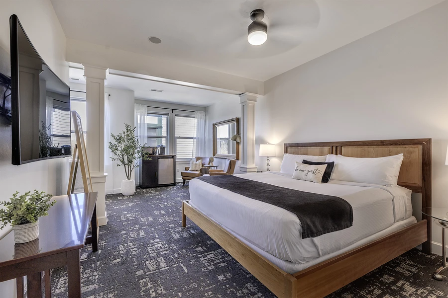 Immerse yourself in luxury and comfort in this spacious room featuring elegant décor and refined details. A plush King bed with high-thread-count linens invites restful sleep, while the sitting area offers a cozy space for relaxation. The room is equipped with modern conveniences, including a Roku-enabled flat-screen TV, high-speed WiFi, and a Keurig coffee station. The spa-inspired bathroom boasts a soaking tub, step-in shower, and premium bath amenities. Natural light floods through large windows, highlighting the stylish furnishings and work desk. Enjoy a serene retreat with thoughtful touches, blending functionality and indulgence. Perfect for the sophisticated traveler.