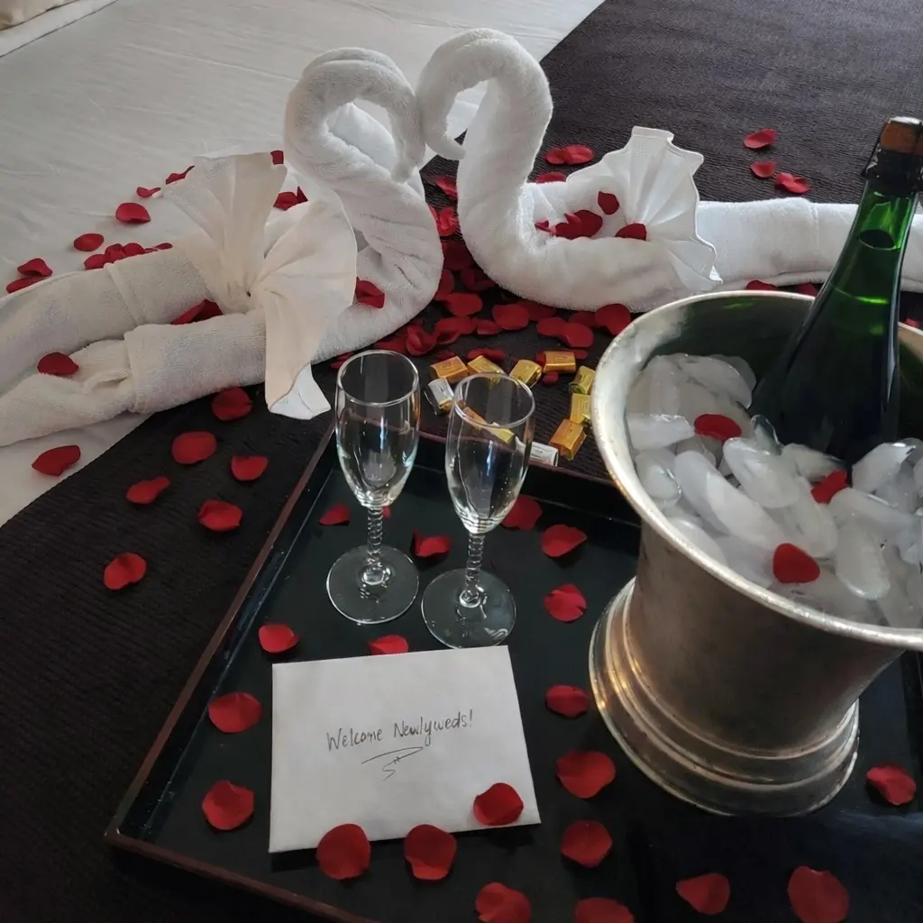 For an additional $10 per room, we can welcome your guests with a bottle of sparkling cider in their room. For the happy couple, we can add on our romance package (which includes a dozen fresh roses and chocolates) for $45 per room. We would also be delighted to work with you on in-room favors or wedding welcome gifts.